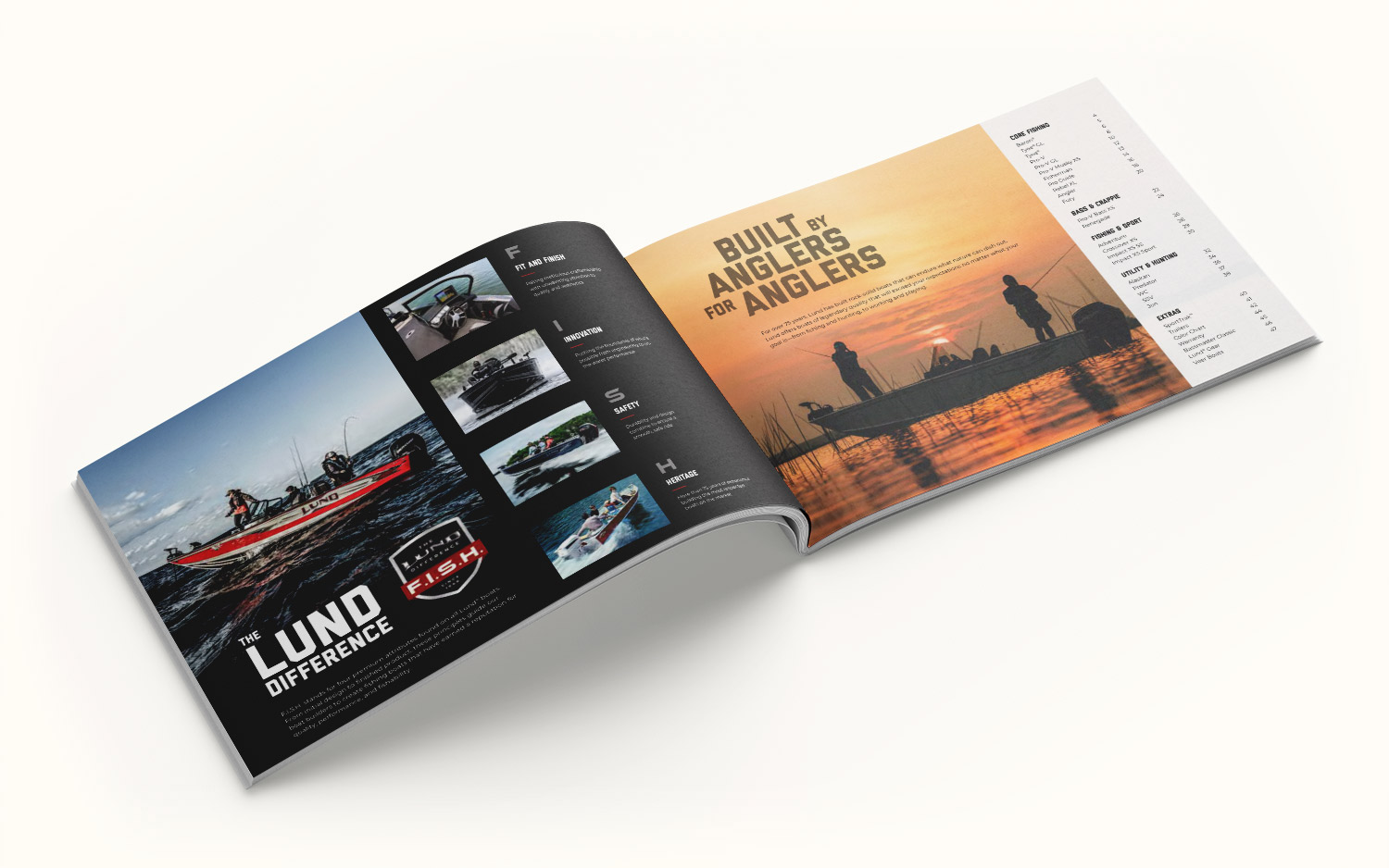 This catalog for Lund Boats was an update to the previous year's redesign. The updates included revised photography and color treatments, new intro page designs, refreshing new models and updating specs. This video shows a fun way to tempt a customer to request a catalog.